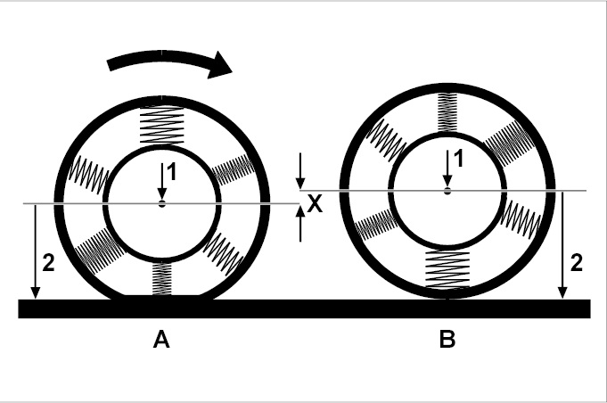 Радиальное усилие – это усилие, с которым шина продавливается. По причине конструктивных и производственно-технических особенностей, на окружности шины имеются более мягкие ( -поз. A- ) и более жесткие зоны ( -поз. B- ). Поэтому при постоянной нагрузке на колесо ( -стрелка 1- ) и постоянном давлении воздуха в шине, шина продавливается различным образом ( -стрелки 2- ). Данные колебания упругости ( -X- ) шины могут вызвать вибрации ходовой части на ровном дорожном покрытии и восприниматься водителем, например, в виде дрожания рулевого колеса. При измерении колебаний радиального усилия (RKS) шина устанавливается на балансировочный станок, способный измерять RKS, и нагружается постоянным усилием. Таким образом моделируется качение шины по дорожному полотну. Колебания радиального усилия возникают независимо от направления вращения шины и измеряется как разность между максимальным и минимальным радиальным усилием (значение двойной амплитуды).