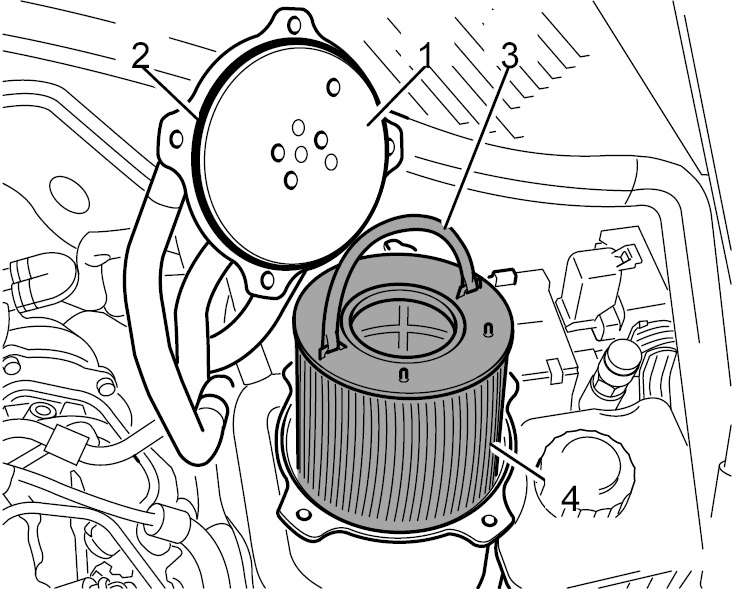 8. Выньте фильтрующий элемент топливного фильтра -4- на монтажной скобе -3- из нижней части топливного фильтра.