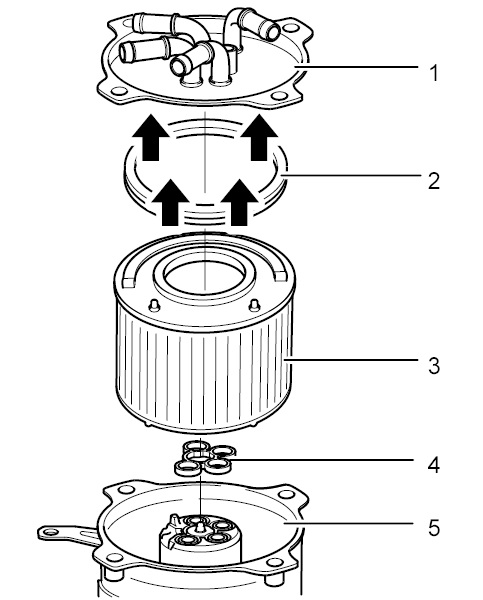 2. Вставить новые уплотнения -4- в нижнюю часть топливного фильтра -5- .