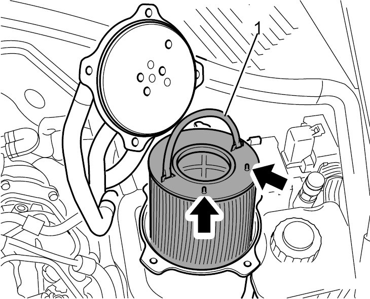 6. Поднимите верхнюю часть топливного фильтра -1- с подключенными топливопроводами.