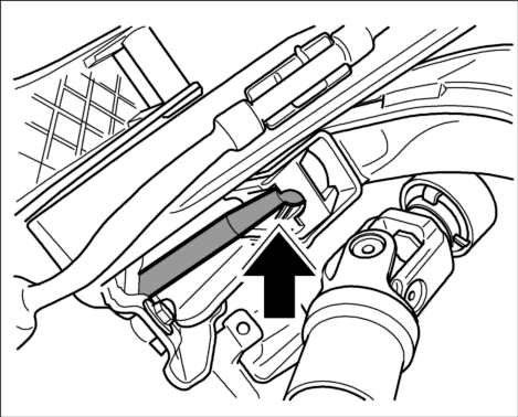 Для этого вставить инструмент для разблокировки T10189 снизу во втулку педали тормоза -стрелка- .