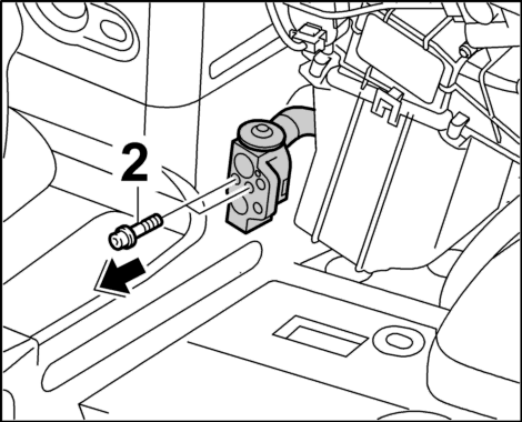 4. Выкрутить оба крепежных винта расширительного клапана -2- и извлечь расширительный клапан.