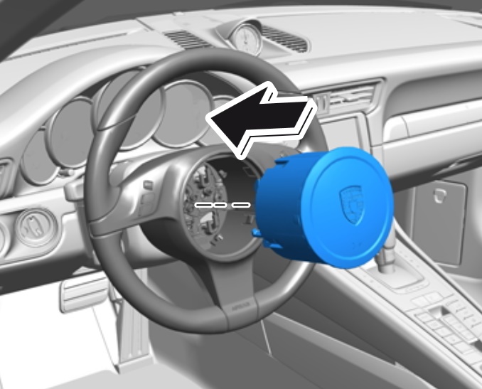 → Модули подушек безопасности всегда располагать выходным отверстием вверх, например, эмблема подушки безопасности водителя