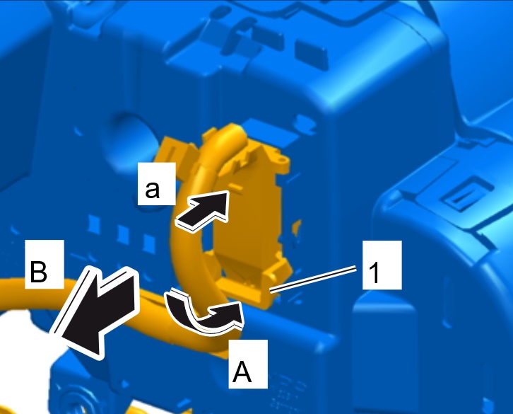 3. Разблокировать скобу -1- электрического разъема -a- и откинуть ее -A- , затем отсоединить разъем -B- .