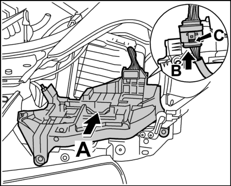 3. Взяться спереди снизу под крепление фары и зазор -стрелки- измерить. Заданный размер = 3 мм