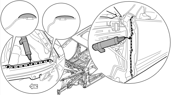 2.1. Перед монтажом крыла нанести на указанные части фланца распыляемый герметик толщиной примерно 3 мм.