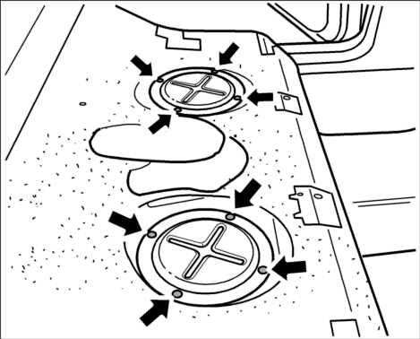 3. Открыть крышки (на рис. изображены обе) -стрелки- . Для этого высвободить ковровое покрытие. Затем отвернуть четыре крепежные гайки и снять крышку.