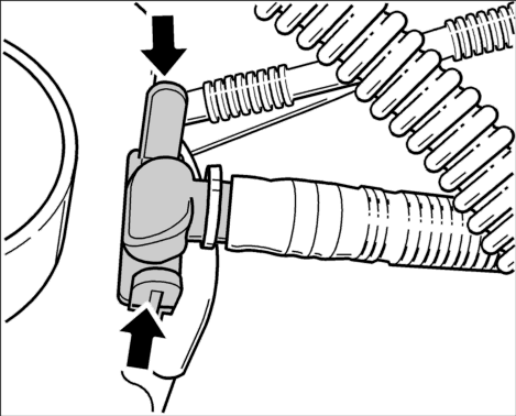 3. Подсоединить патрубок эжекционного насоса. Патрубок должен войти в фиксатор с ощутимым щелчком. → Соединение эжекционного и топливного насосов