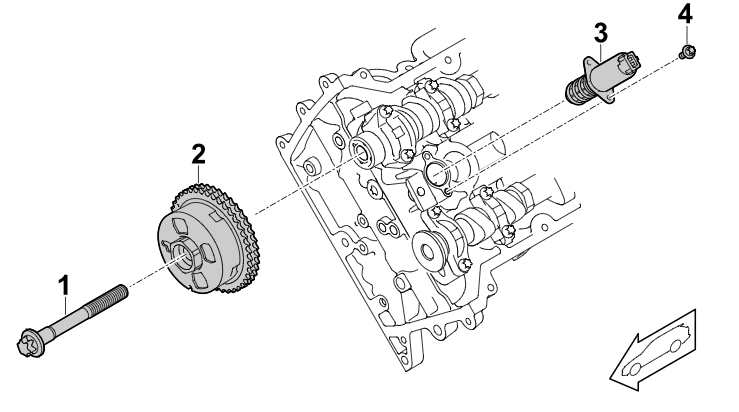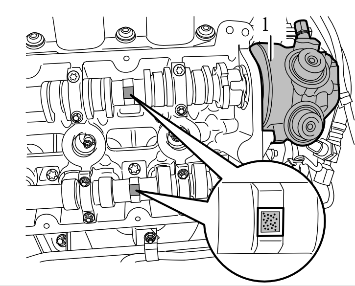 1 - Винт M12, полная затяжка после регулировки фаз газораспределения! ; винт подлежит замене; предварительная затяжка 1-й этап → Момент затяжки: 10 Nm; предварительная затяжка, 2-й этап → Момент затяжки: 30 Nm; предварительная затяжка, 3-й этап (угол затяжки) → Угол затяжки: 100°; процесс ослабления, 1-й этап → Угол затяжки: 90°; процесс ослабления, 2-й этап → Угол затяжки: 360°; окончательная затяжка, 1-й этап → Момент затяжки: 30 Nm; окончательная затяжка, 2-й этап (угол затяжки) → Угол затяжки: 135°