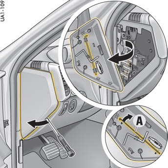 1. Осторожно подцепите подходящим предметом (например, отверткой) крышку блока предохранителей на стороне водителя и снимите ее.