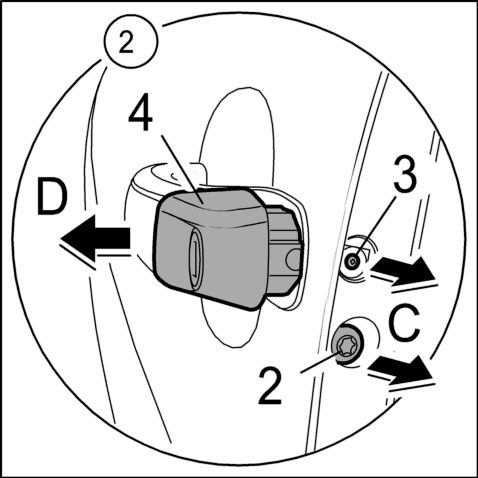 2.2. Крепежные винты -2, 3- ввернуть сбоку -стрелки C- и затянуть с моментом затяжки → момент затяжки: 4,5 Nm+/-0,4 Nm → момент затяжки: 0,6 Nm.