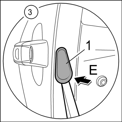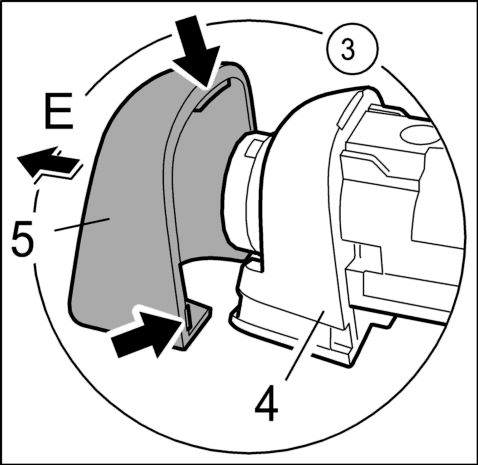 4.1. Расфиксировать крышку -5- цилиндра замка -4- из деблокирующих язычков -стрелки- и снять -стрелка E- .