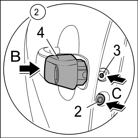 2.1. Вставить ключ автомобиля в личинку замка и личинку -4- вставить на место -стрелка B- , при этом ключ автомобиля слегка повернуть направо. В случае необходимости немного ослабить крепежные винты -2 и 3- до тех пор, пока личинку замка не удастся вставить полностью.