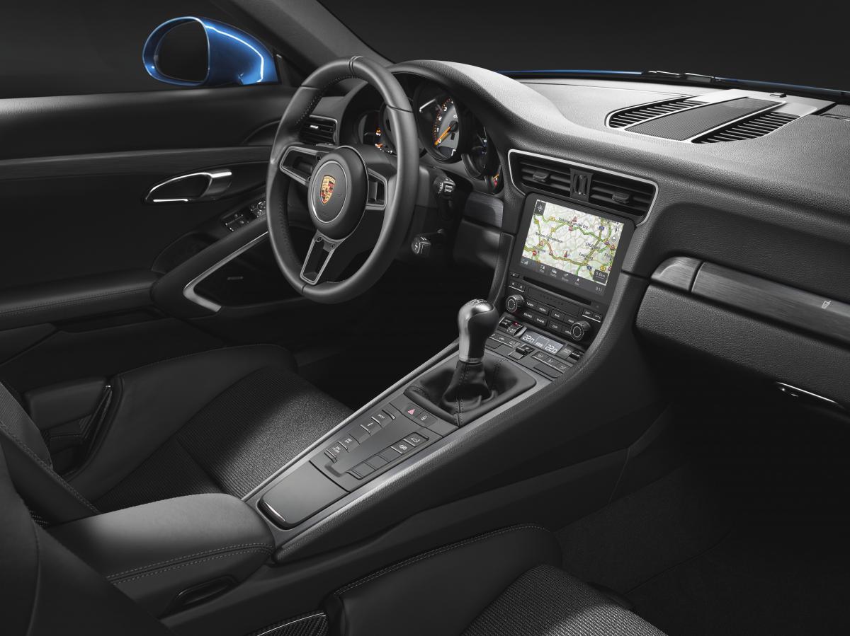 В салоне автомобиля царит атмосфера классических спорткаров с механической коробкой передач. В соответствии с философией чистокровных автомобилей класса GT в отделке интерьера вместо альканатары преобладает высококачественная кожа. Обод рулевого колеса с отметкой на 12 часов, рычаг селектора КПП, подлокотники на панелях дверей, крышка отсека для хранения на центральной консоли и внутренние ручки дверей отделаны гладкой кожей. Центральные части сидений обиты тканью черного цвета. Подголовники сидений украшены тиснением в виде гербов Porsche, а все швы в салоне с кожаной отделкой выполнены нитями черного цвета. Завершают дизайн салона декоративные планки из алюминия черного цвета.