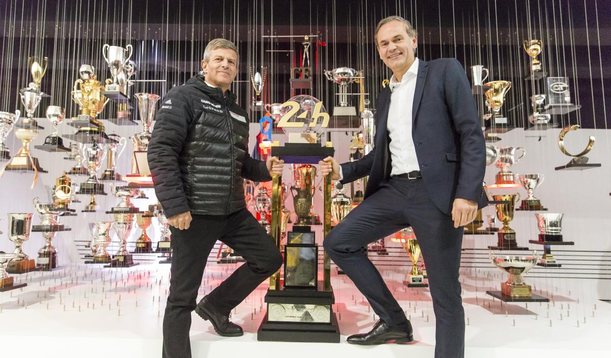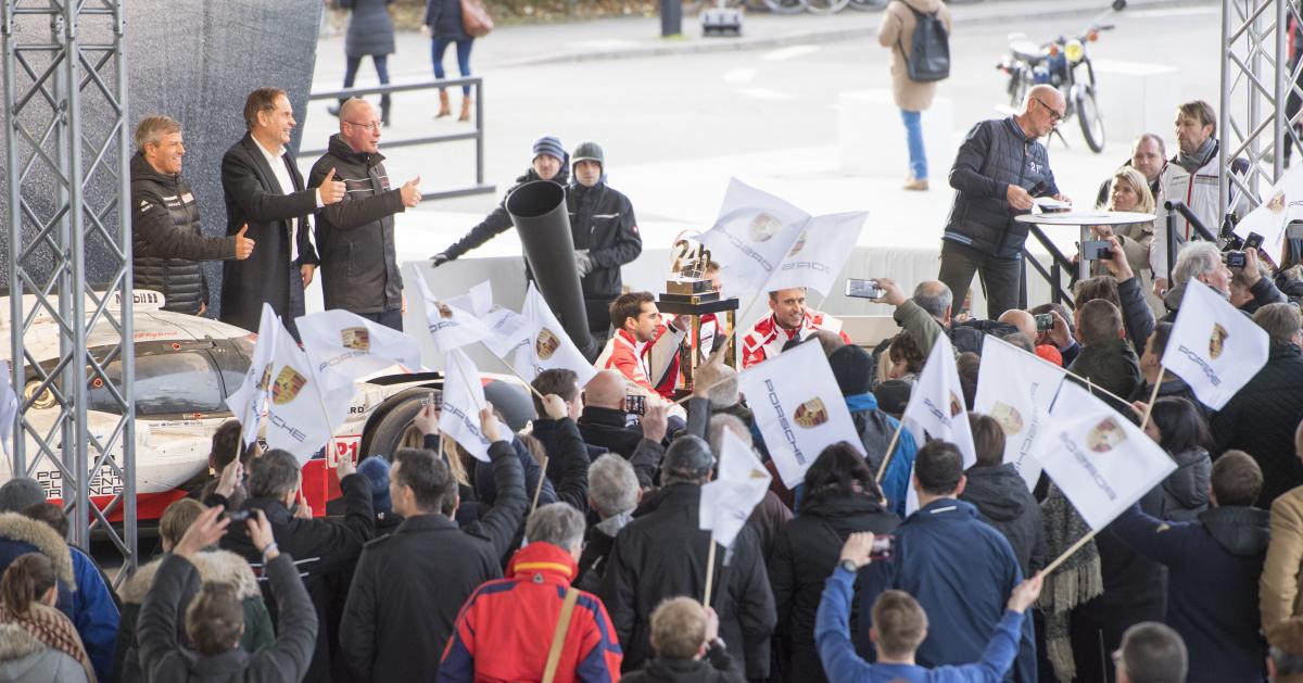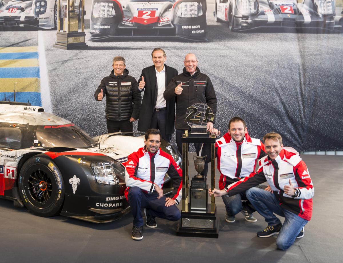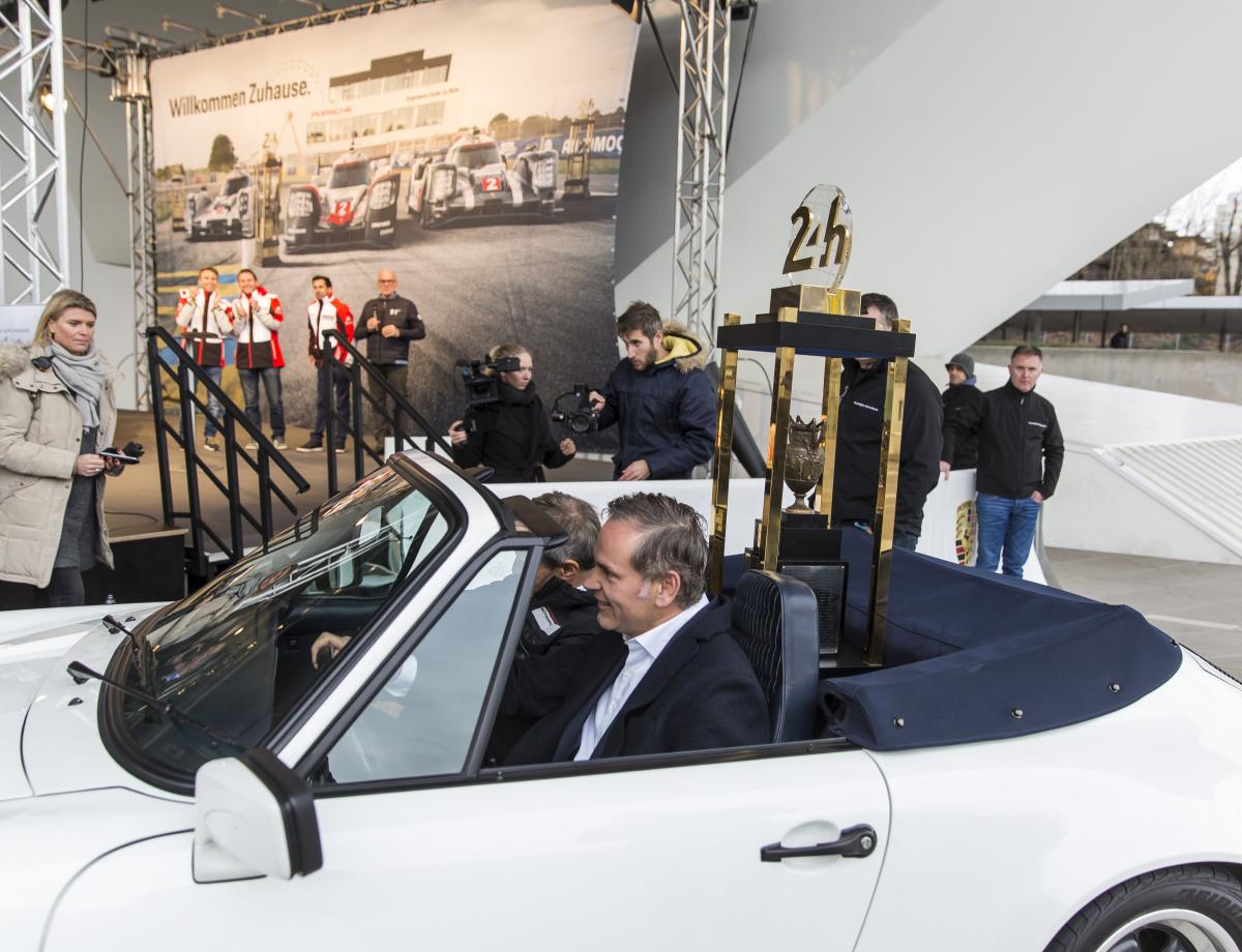 Штуттгарт. Победный кубок «24 часа Ле-Мана» обрёл свой новый дом в музее Porsche. После трех побед подряд в общем зачете самого сложного марафона в мире Porsche получает право оставить переходящий кубок у себя навсегда. Победители Ле-Мана и заводские пилоты Porsche 919 Hybrid Тимо Бернхард (Германия), Нил Яни (Швейцария) и Ник Тэнди (Великобритания), а также руководитель LMP Фриц Энцингер официально передали приз весом почти 50 килограммов в музей Porsche. Трофей приняли Оливер Блуме, председатель правления Porsche AG, а также председатель производственного совета и исполняющий обязанности председателя наблюдательного совета компании Уве Хюк. Уже сейчас кубок можно видеть в постоянной экспозиции музея.