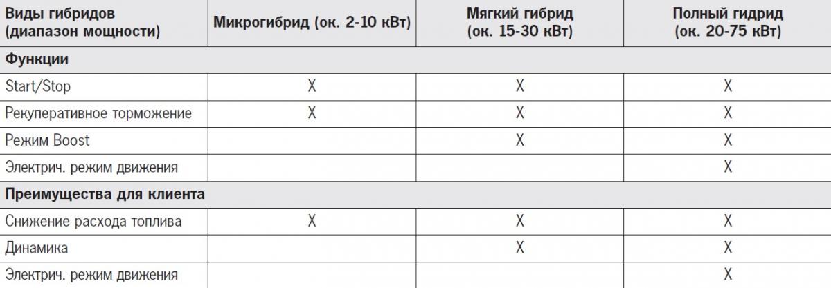 Слово "гибрид", которое изначально происходит из греческого языка и означает "смешанный" или "двойного происхождения", указывает на то, что у гибрида тягу создают два привода. В зависимости от объема реализуемых функций различают микрогибриды, мягкие и полные гибриды. Объем функций, преимущества для клиента, а также сложность и связанная с ней стоимость разработки от микрогибрида к полному гибриду возрастают. Полный гибридный привод обеспечивает возможность движения на одной электрической тяге, а также движения на короткие расстояния без вредных выбросов в зависимости от емкости батареи и тем самым дает клиенту максимальные преимущества.