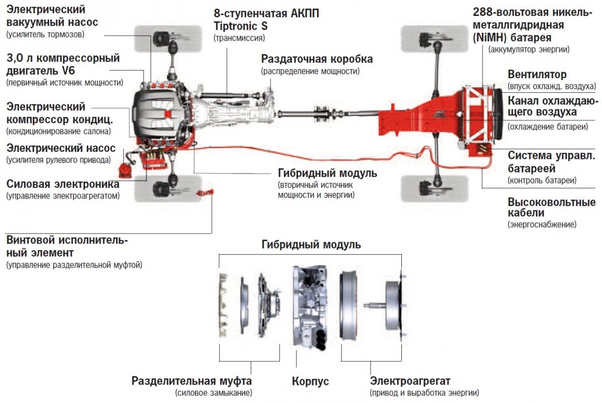 У Cayenne S Hybrid речь идет о концепции одновального параллельного полного гибрида, который с помощью первичного вала одновременно (параллельно) передает тяговые усилия двигателя внутреннего сгорания и электроагрегата. Первичным двигателем при этом является 3,0-литровый компрессорный двигатель V6 с непосредственным впрыском бензина. Он соединен на одном валу с электроагрегатом мощностью 34 кВт (47 л.с.), который либо обеспечивает дополнительную мощность для двигателя внутреннего сгорания, либо в качестве самостоятельного привода позволяет двигаться на одной электрической тяге. Кроме того, электроагрегат объединяет обе функции стартер-генератора и поэтому может запускать двигатель внутреннего сгорания, а в режиме генератора – вырабатывать электроэнергию (преимущество: отсутствие традиционного генератора). Электроагрегат компактно интегрирован в гибридный модуль и находится между двигателем внутреннего сгорания и коробкой передач. Электроэнергией агрегат обеспечивает мощная высоковольтная батарея, которая, во первых, снабжает привод энергией, а во вторых, может накапливать энергию, полученную в результате рекуперации при торможении.