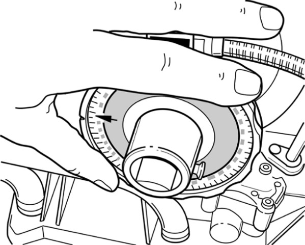Установить индикатор угла затяжки. Механический индикатор угла затяжки для затяжки на определенный угол. Установить магнитную ножку на металлический элемент и поворотом сбросить шкалу на 0. В качестве альтернативы применению индикатора угла затяжки можно нанести водостойким маркером метки на демпфере крутильных колебаний (ременном шкиве коленчатого вала) и центральном винте. Сплошная метка на крепежном винте и демпфере крутильных колебаний используется в качестве исходной точки, еще одна метка только на демпфере крутильных колебаний, нанесенная под углом 90° к первой метке, является конечной точкой затяжки.