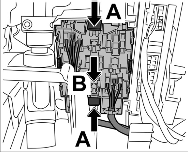 1 Разблокировать левый держатель реле -стрелки A- и вытянуть его вниз -стрелка B-.