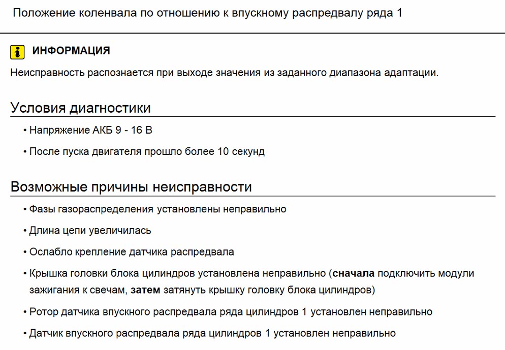 Неисправность P0016 – ниже / выше предельного значения регистрируется при выходе из заданного диапазона регулирования (V8 = ± 12° поворота распредвала и V6 = ± 13,5° поворота распредвала).