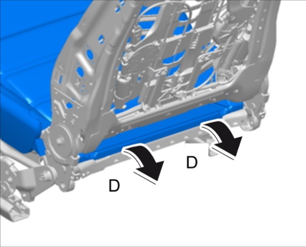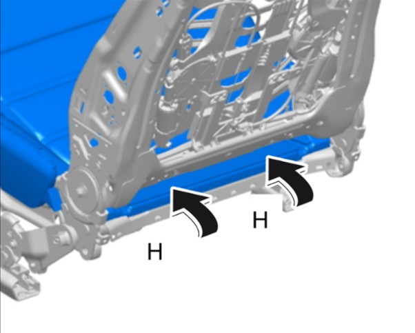 9 На автомобилях с удлинением подушки сиденья: зацепить обивку на элементе удлинения поверхности подушки сиденья -H-.