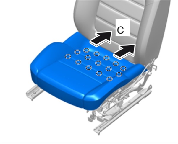 3 Протянуть обивку между мягким наполнителем подушки сиденья и спинкой назад -C-.