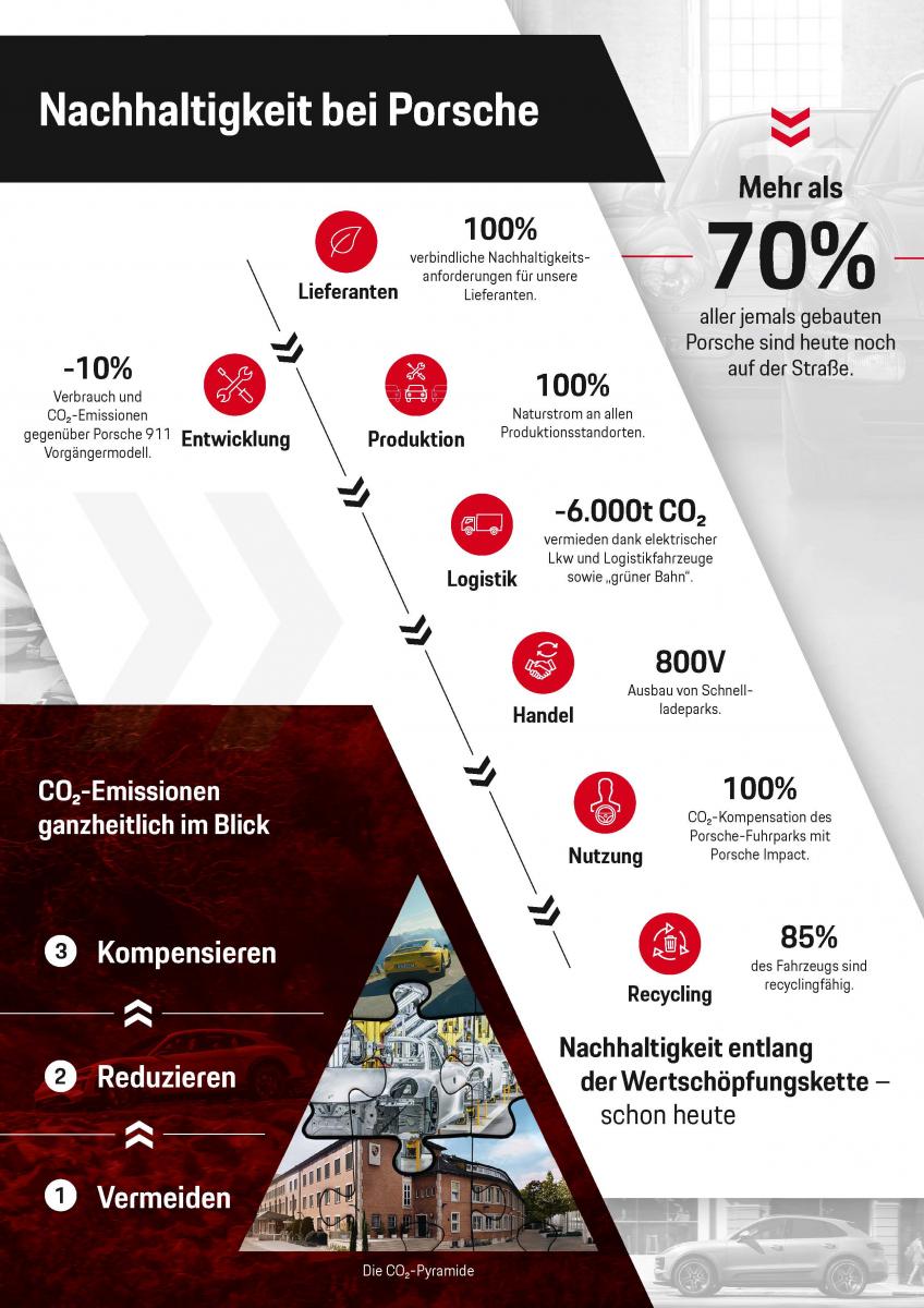 Ответственный подход имеет давние традиции на Porsche: так, более 70 процентов всех когда-либо построенных Porsche по сей день ездят по дорогам мира. В начале семидесятых годов на предприятии был положен конец ржавчине, и с внедрением в производство горячеоцинкованной листовой стали была введена долгосрочная гарантия. На тот случай, если Porsche все же когда-нибудь будет утилизирован, отдельные детали и материалы созданы таким образом, что 85 процентов автомобиля пригодны для вторичной переработки. Благодаря многочисленным инновациям, таким как высокоэффективные металлические катализаторы отработавших газов, компания Porsche всегда занимала лидирующие позиции в том числе в области охраны окружающей среды и устойчивого развития.