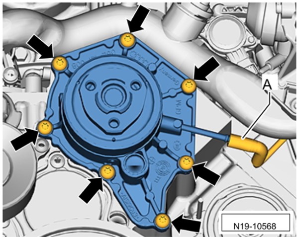 2 Отсоединить шланг -A-, вывернуть винты -стрелки- и снять насос ОЖ.
