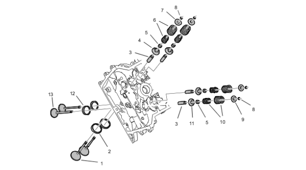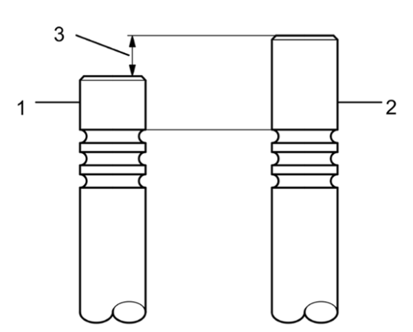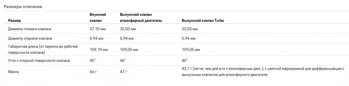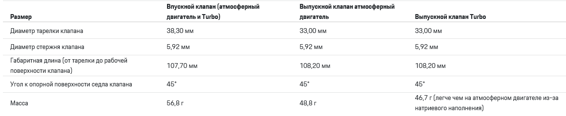 На Turbo выпускной клапан имеет внутреннюю и внешнюю пружины клапана (комплект пружин клапана) и адаптированную тарелку пружин. Выпускной клапан Turbo имеет те же внешние размеры, что и выпускной клапан атмосферного двигателя. Выпускной клапан Turbo легче из-за натриевого наполнения и имеет более длинный стержень над проточками. Подробности, рисунки и таблицу см. “Размеры клапана” ниже.