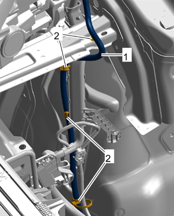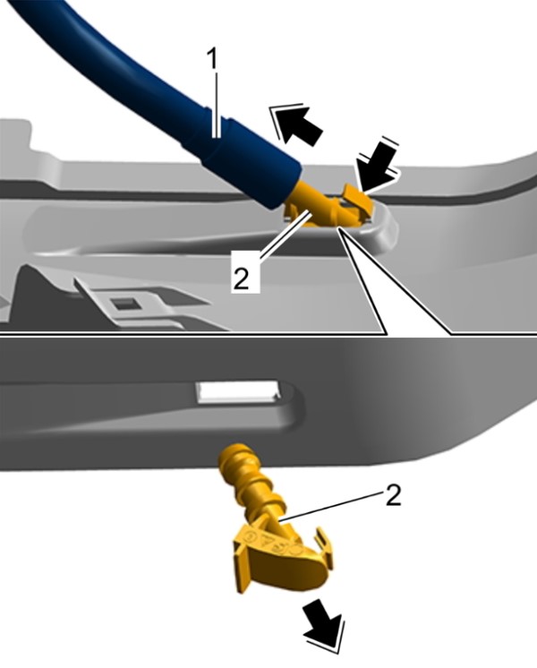4 Отсоединить вентиляционный шланг -1- от крепежных зажимов -2-.