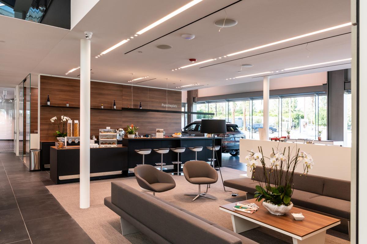 В центре Porsche внимание привлекают тематические модули с возможностью свободного оформления и изменения. Интерьер можно легко адаптировать к региональным или индивидуальным особенностям. Модули посвящены новинкам, электромобильности или автомобилям с пробегом. Важным элементом являются новые зоны отдыха для клиентов и приверженцев марки. Через большие стеклянные окна открывается вид на ремонтную зону – аналогично тому, как это сделано в ресторанах с «открытой» кухней.