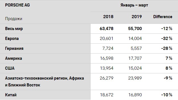 В США в первом квартале компании Porsche удалось добиться роста в размере восьми процентов. Всего клиентам здесь было передано 15 024 автомобиля, что делает США вторым рынком после Китая. Здесь продажи упали на 10 процентов до 16 890 автомобилей, что обусловлено ослаблением всего рынка и временным снижением покупательной активности в связи с предстоящим в апреле уменьшением налога на добавленную стоимость. Продажи в Европе также ниже показателя прошлого года.