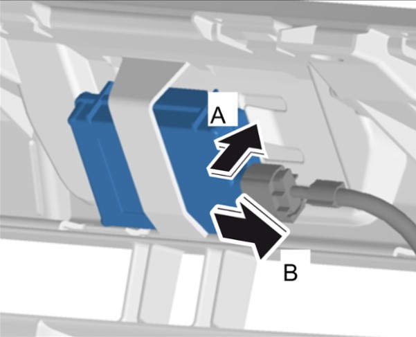 1 Разблокировать фиксатор -A- и выдвинуть блок управления системы открывания ворот гаража из держателя -B-.
