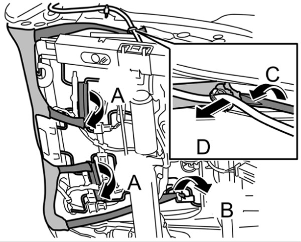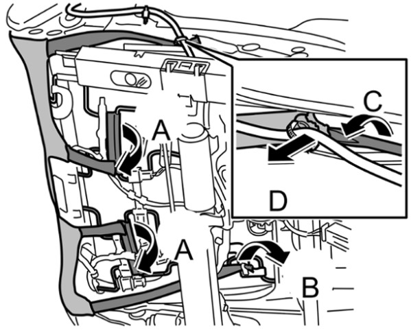 3 Отверткой -C- поддеть фиксатор -D- и снять резиновую ленту с фиксатора.