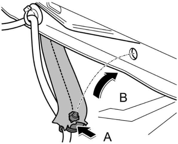 2 Установить резиновую ленту внутр. на крепежной клипсе -стрелка A- кабеля замка ремня безопасности и закрепить клипсу резиновой лентой на каркасе сиденья -стрелка B-.