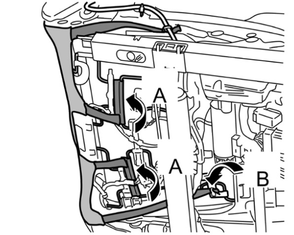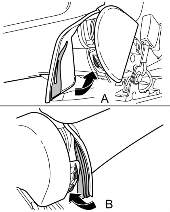 4 Вывесить накладку на внутренней боковой -стрелка A- и наружной обшивке -стрелка B- .