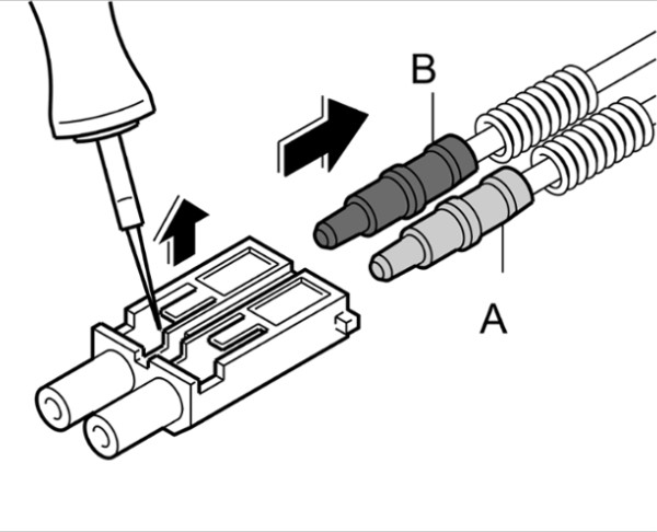 3 Осторожно потянуть за световоды -A и B- в направлении -направление стрелки-. Если световод не извлекается, повторно проверить, полностью ли разблокирован вторичный фиксатор и достаточно ли поднимается первичный фиксатор.