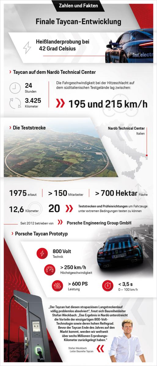 Штутгарт. Незадолго до мировой премьеры, которая состоится 4 сентября, близкий к серийному исполнению прототип Taycan на высокоскоростной трассе испытательного полигона в Нардо (Италия) за 24 часа преодолел ровно 3425 километров. Это примерно соответствует пути от Нардо до Тронхейма (Норвегия). Средняя скорость в жарких условиях Южной Италии была в пределах 195 – 215 км/ч. При температуре воздуха, доходившей до 42 C, и температуре асфальта до 54 C прототип Taycan еще до начала серийного производства убедительно доказал свою пригодность для дальних поездок. Предсерийный Taycan ехал без перерывов, краткие остановки совершались только для быстрых пит-стопов на зарядку и для замены пилотов. Команда состояла из шести гонщиков-испытателей Porsche. Тест для подтверждения гарантированного качества проводился в рамках испытания на выносливость в жарком климате.