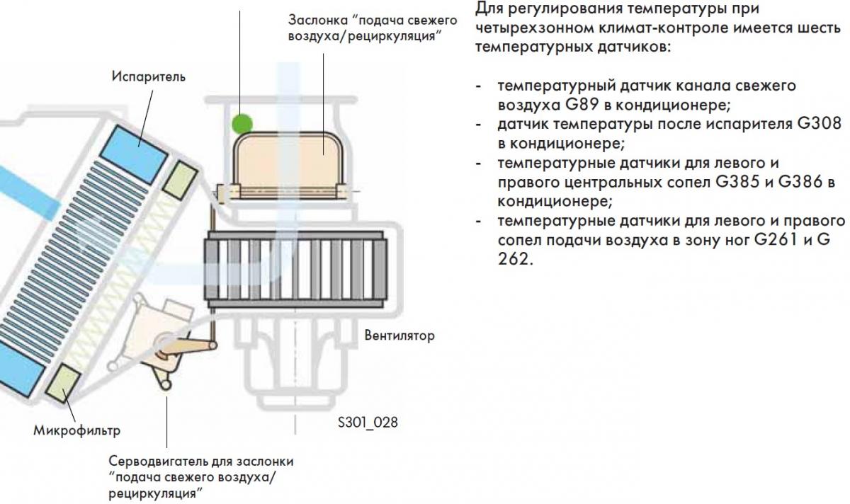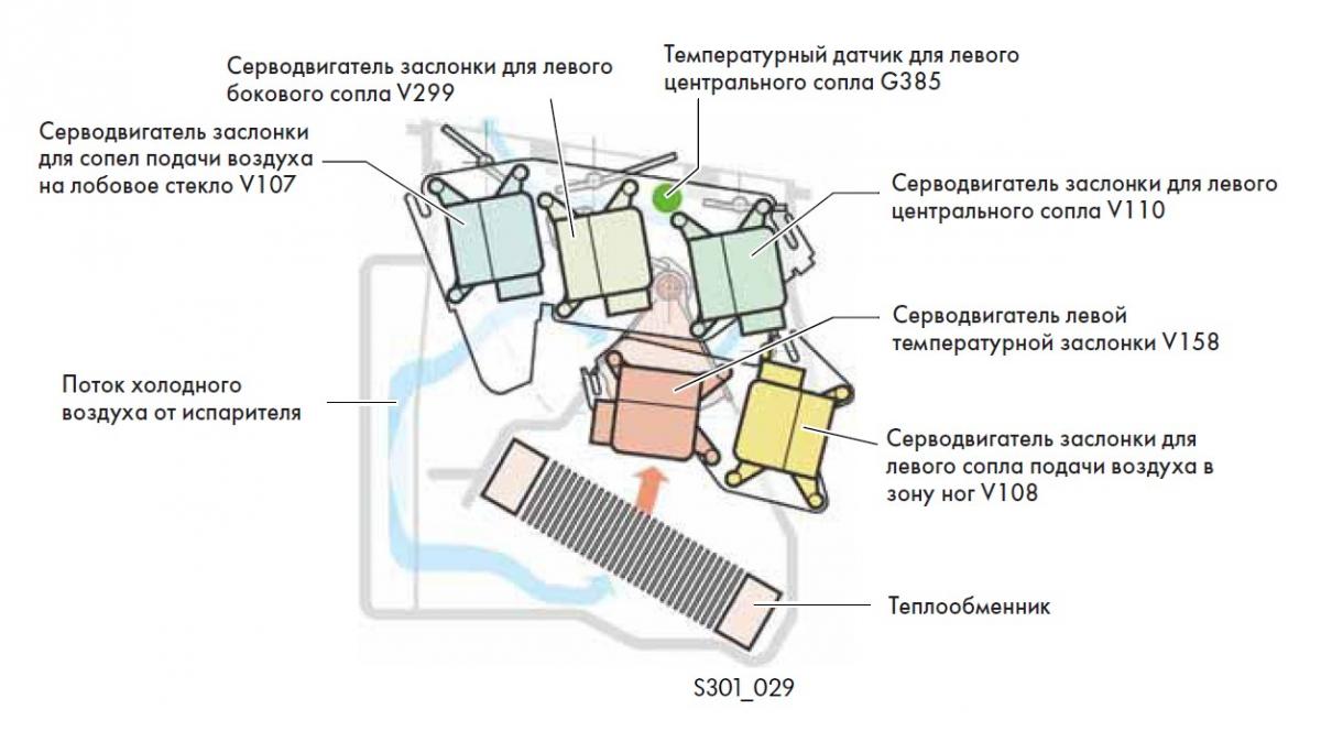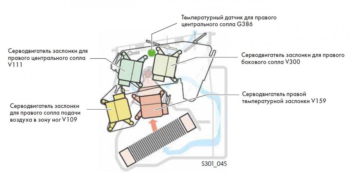 Обе климатические зоны двухзонного климат-контроля обслуживаются одним кондиционером. При этом потоки воздуха в левую и правую половины автомобиля подаются раздельно. Подача воздуха осуществляется к следующим соплам: