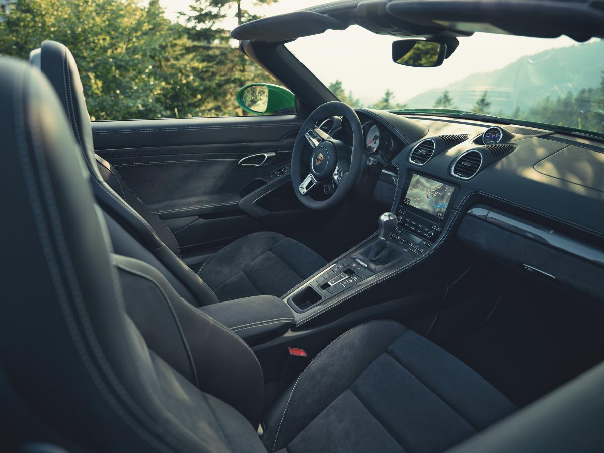 В салоне спортивную и элегантную атмосферу создает темная Alcantara®. Она украшает центральные части серийных спортивных сидений Plus, а также обод рулевого колеса, центральную консоль, рычаг переключения передач и подлокотники на обеих дверях. В 718 Cayman GTS 4.0 она, кроме того, используется на передних дверных стойках и потолке. Дополнительные цветные акценты вносит опциональный пакет отделки салона GTS: на выбор предлагаются цвета Carmine Red и Crayon. В соответствующем цвете выполняются циферблат тахометра, ремни безопасности, вся декоративная строчка, включая вышитые эмблемы GTS на подголовниках, а также надпись Porsche на ковриках с черной окантовкой. Декоративные элементы и накладка центральной консоли выполнены из карбона.