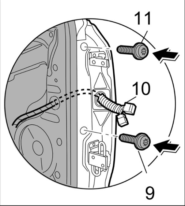 Зафиксировать крепежную раму двери на каркасе двери путем вкручивания крепежных винтов -9, 11- . При этом нажать крепежную раму двери кверху и слегка затянуть крепежные винты.