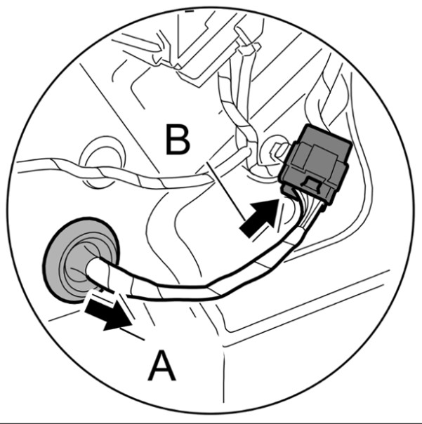 Протянуть жгут проводки Kessy через отверстие вовнутрь. Установить резиновую втулку в крепежную раму двери до ее фиксации по окружности (-стрелка A- ).