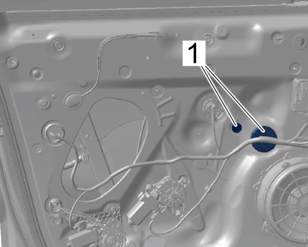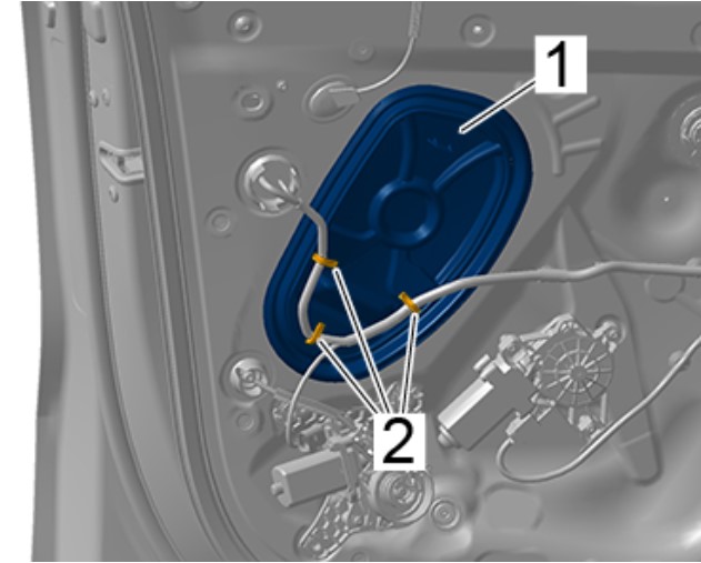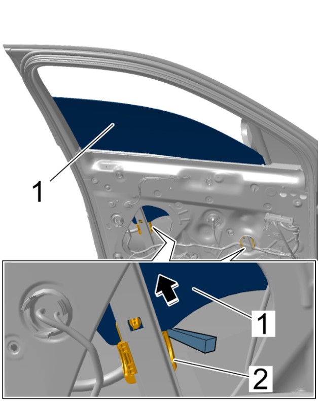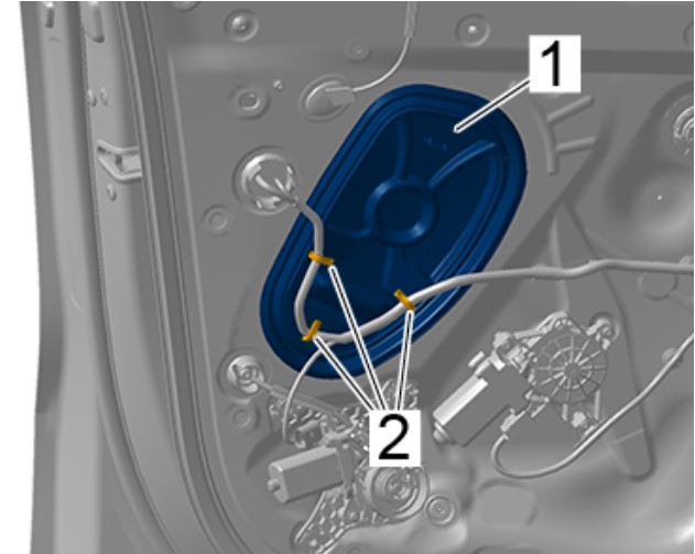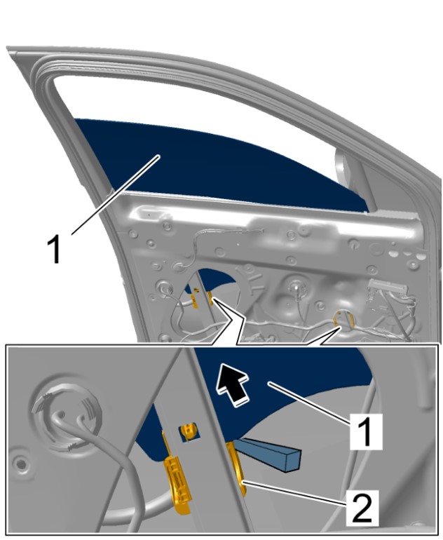 1.2 Поднять стекло передней двери -1-, чтобы обеспечить доступ к крепежным зажимам -2-.