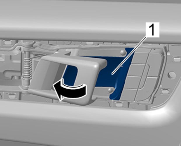 2 Открыть дверную ручку -стрелка- и отсоединить облицовку -1-.