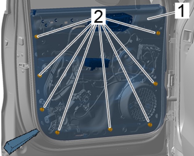 4 С помощью пластикового клина отсоединить зажимы -2- в обшивке передней двери -1-.