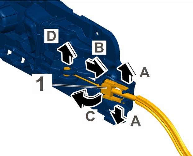 7.3 Извлечь трос ручки открывания двери -1--стрелка D-.