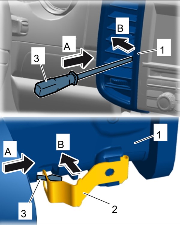 1 Над первой пластиной снизу с внешней стороны вставить небольшую отвертку -3- в проушину металлической скобы -2- и потянуть металлическую скобу вовнутрь -стрелка B- (проушина видна сквозь пластину). При этом извлечь дефлектор -1- (изображено на примере дефлектора спереди посередине).