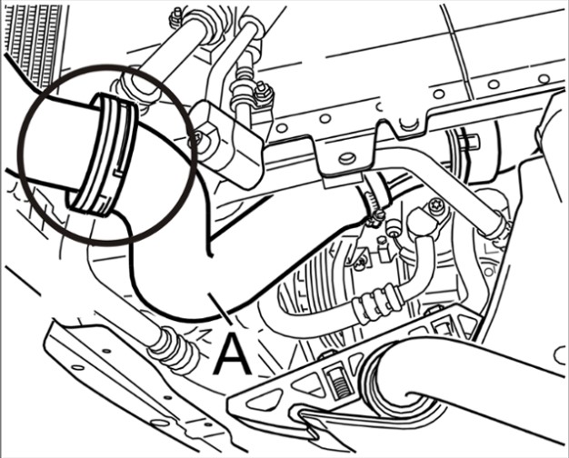 Масляный туман может попасть через турбонагнетатель в напорный шланг (-поз. A-) между турбонагнетателем и интеркулером, после чего осесть в области быстроразъемного соединения напорного шланга на интеркулере (-круг-).