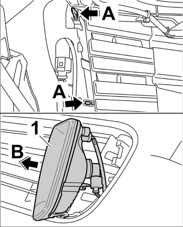 1 Отсоединить передний указатель поворота -1- от крепежных язычков -стрелки A- и извлечь вперед из облицовки передней части кузова -стрелка B-.