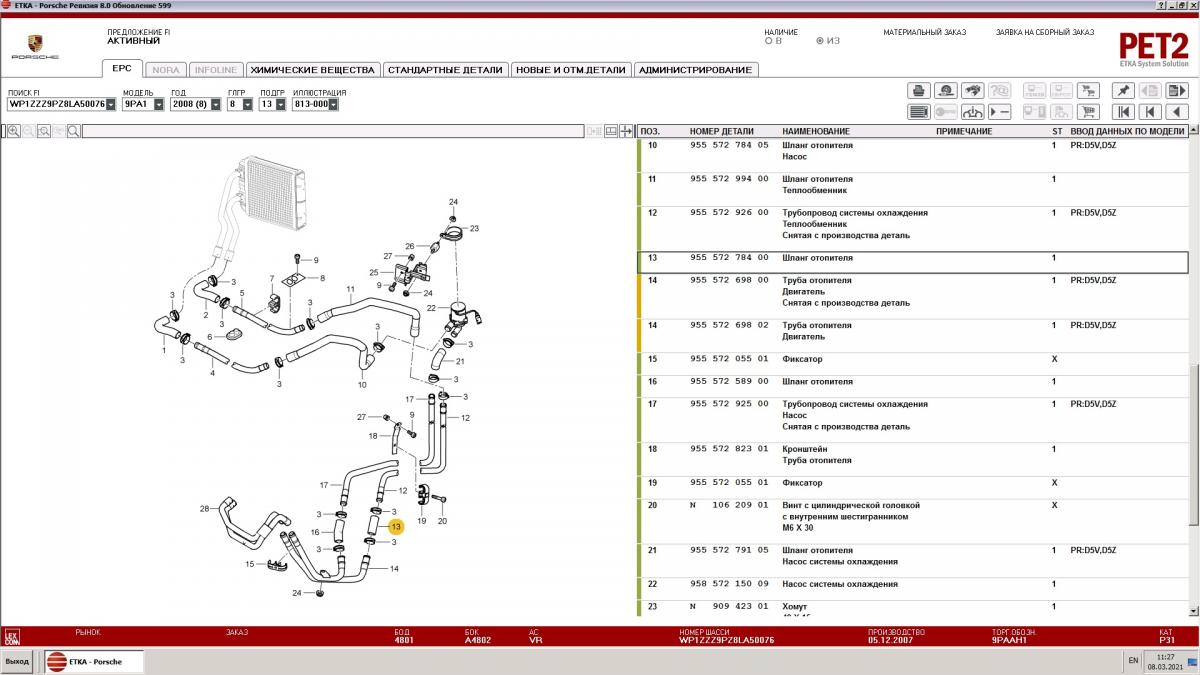 Добрый день! Загорелась надпись долить охлаждающую жидкость, при визуальном осмотре выяснили, что прохудился короткий патрубок под левым подкрылком. Подскажите пожалуйста стоимость патрубков №13,16 на схеме и стоимость работ по замене? WP1ZZZ9PZ8LA50076